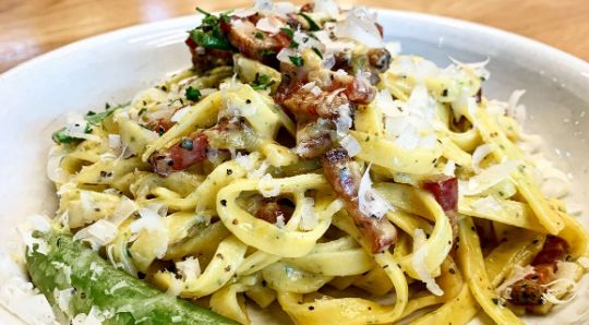 Black pepper fettuccine, pancetta, yolks, arugula, grana padano.